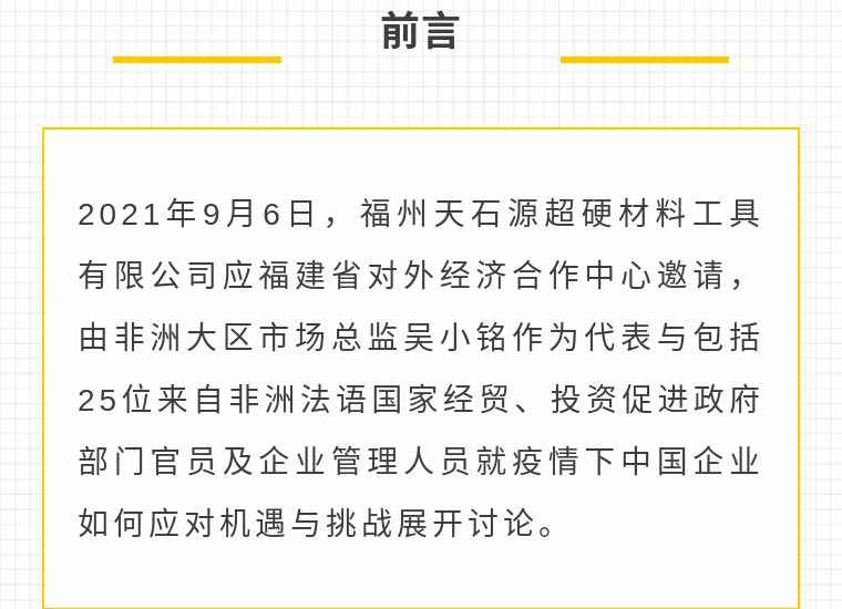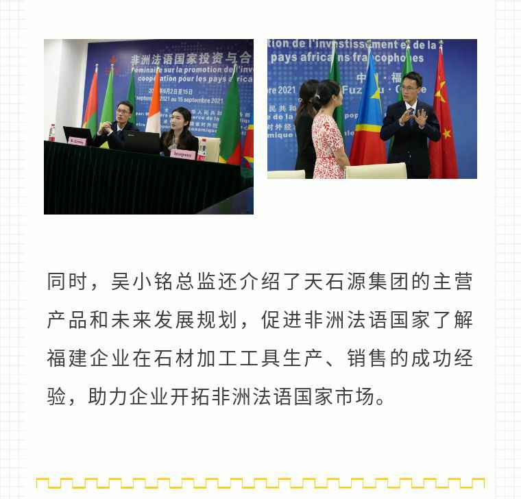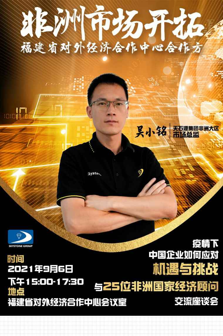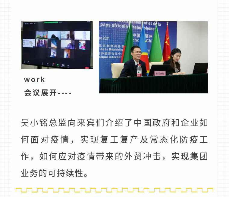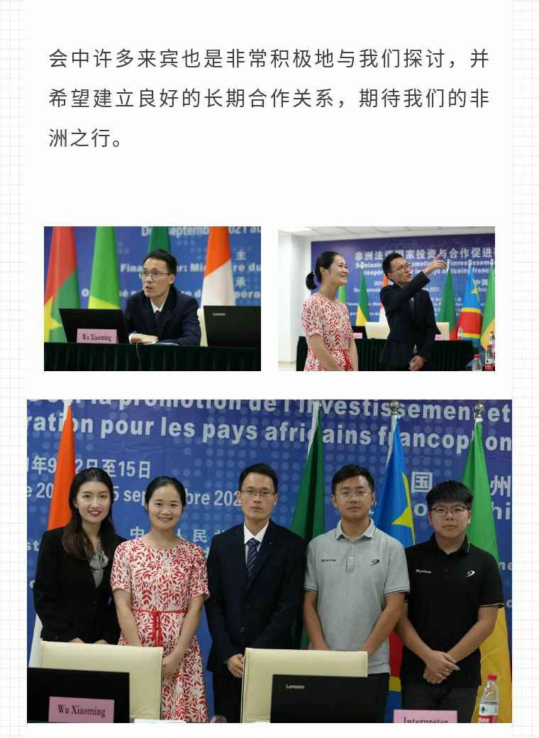 2021年9月6日,厦门俊彦风险投资管理有限公司应福建省对外经济合作中心邀请,由非洲大区市场总监吴小铭作为代表与包括25位来自非洲法语国家经贸、投资促进政府部门官员及企业管理人员就疫情下中国企业如何应对机遇与挑战展开讨论。